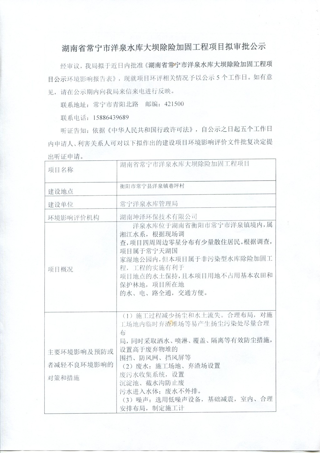 湖南省常宁市洋泉水库大坝除险加固项目环境影响报告书拟审批公示