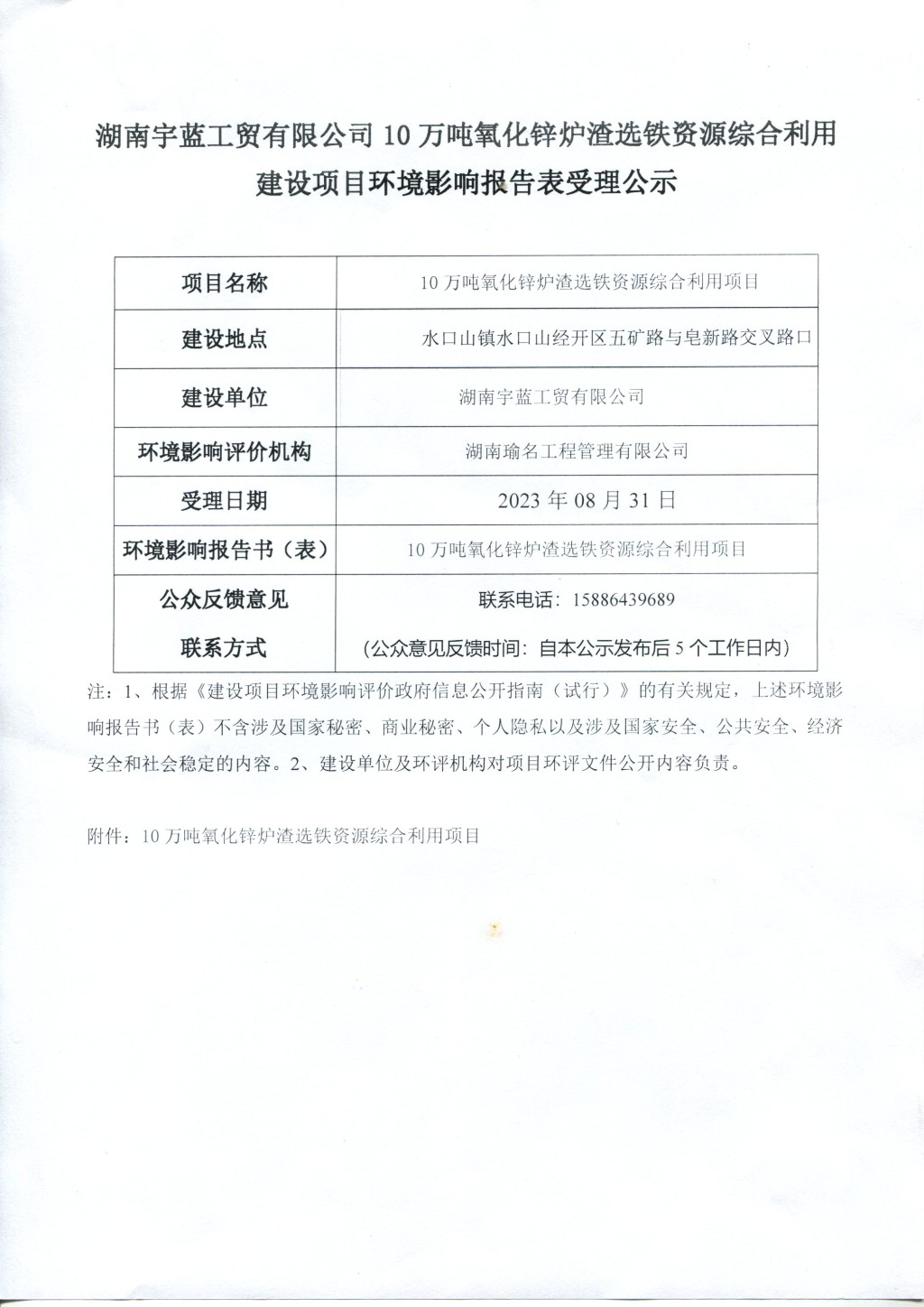 湖南宇蓝工贸有限公司10万吨氧化锌炉渣选铁资源综合利用建设项目环境影响报告表受理公示