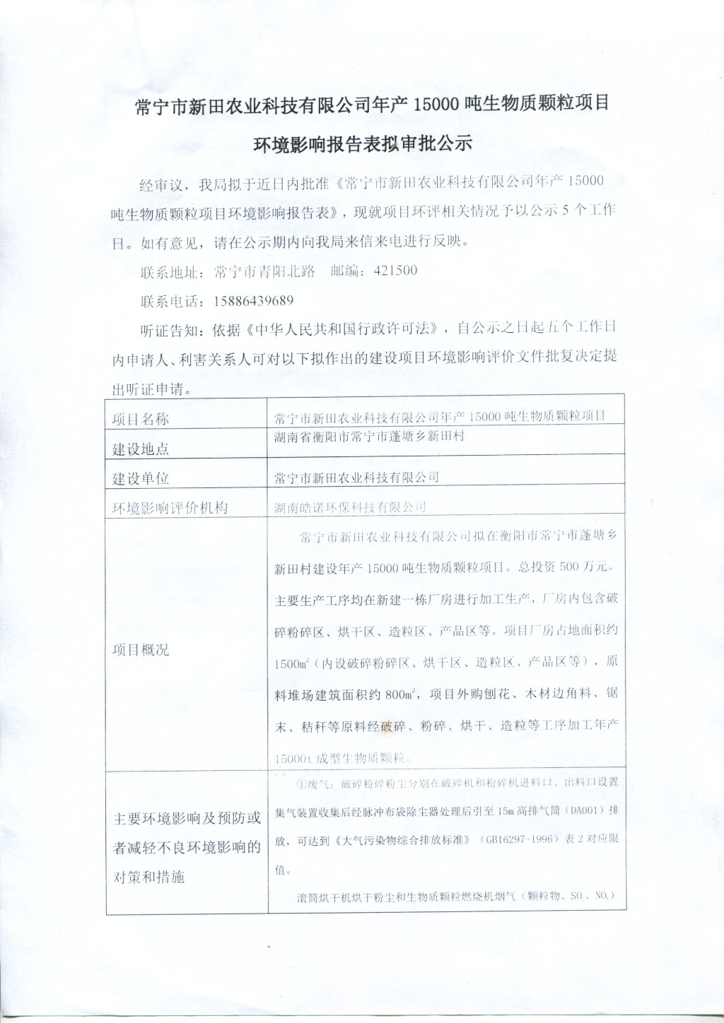 常宁市新田农业科技有限公司年产15000吨生物质颗粒项目环境影响报告表拟审批公示