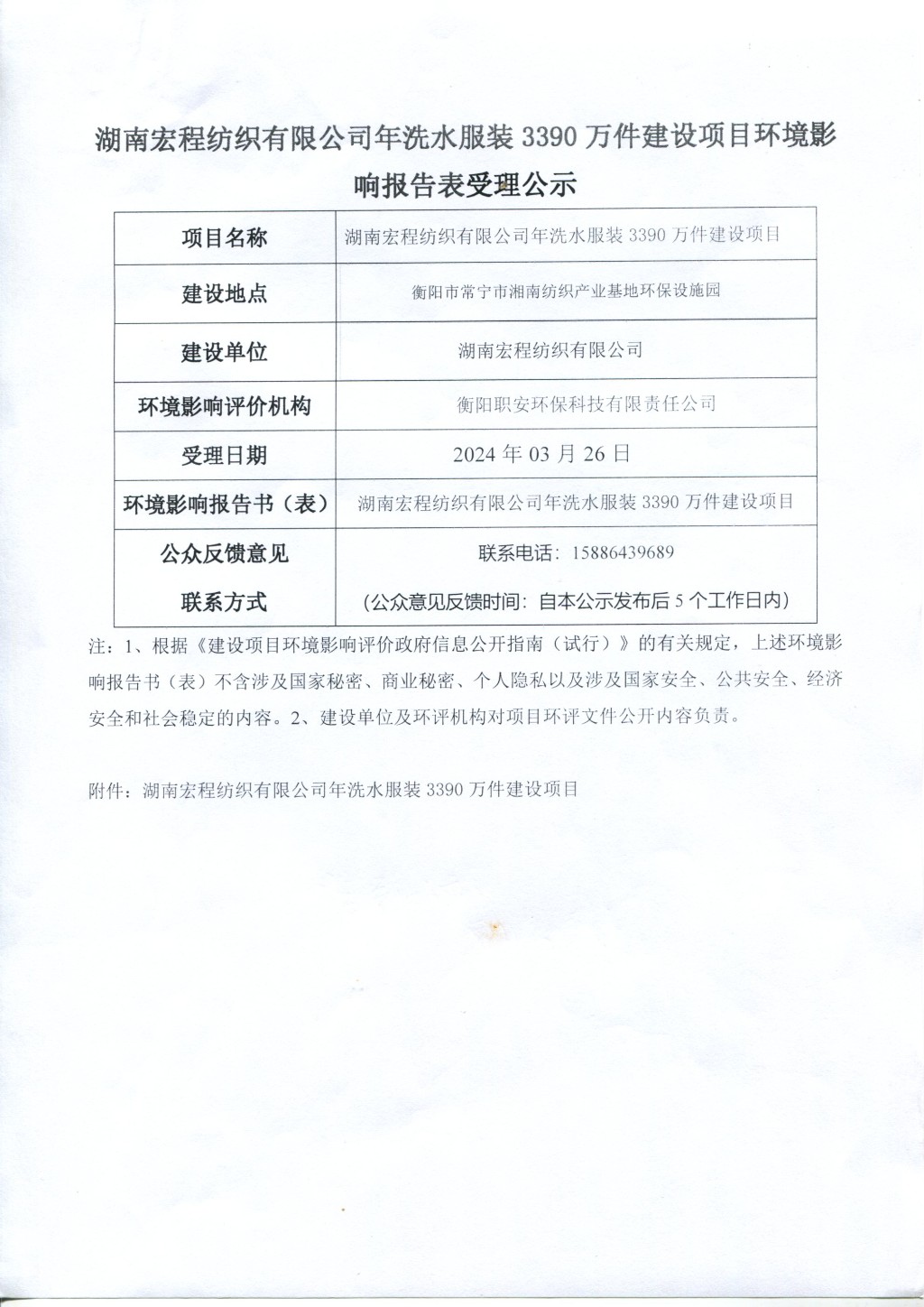 湖南宏程纺织有限公司年洗水服装3390万件建设项目环境影响报告表受理公示