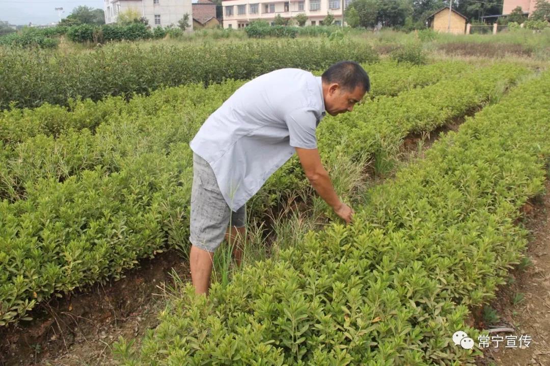 9点35分,驻村扶贫工作队队长吴传厚、村支书吴代和、村主任崔永国等来到苗木基地,查看幼苗长势。该基地共150亩,由崔永国管理,种植有桂花、楠木、红枫、罗汉松等幼苗及成树,请了村里10多名贫困户在基地务工,按点工发放务工费。