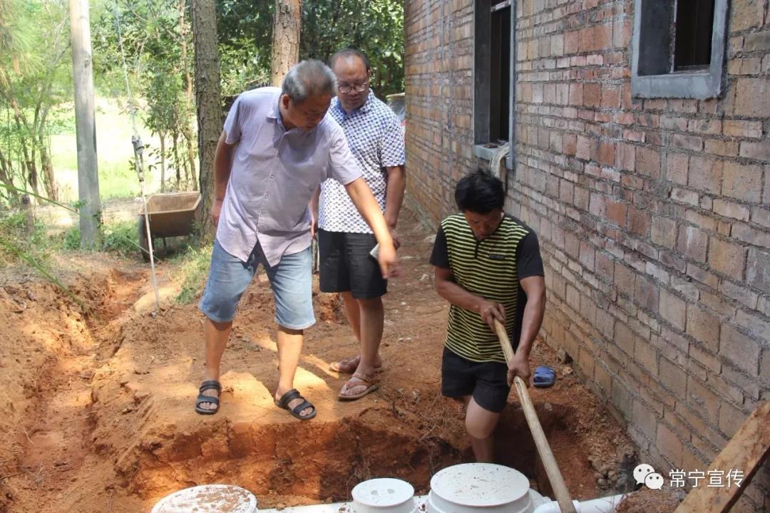 14点36分,吴传厚、吴代和来到鲁冲组贫困户崔运东家危房改造项目现场,施工人员正在挖土填埋化粪池。他们向施工人员指导改水改厕注意事项。