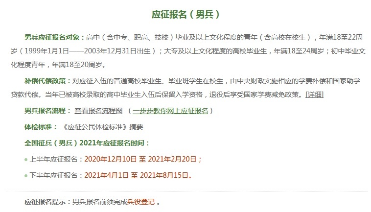 上半年应征报名:普通高等学校全日制应届毕业生及在校生,年满18至22周岁;2020年普通高等学校全日制应届毕业生可以报名参加2021年上半年女兵征集,年龄放宽至23周岁。
