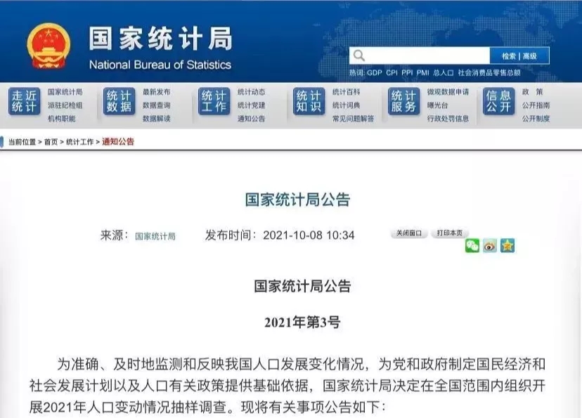 近日,国家统计局发布通告:10月10日起至11月15日在全国范围内组织开展2021年人口变动情况抽样调查。