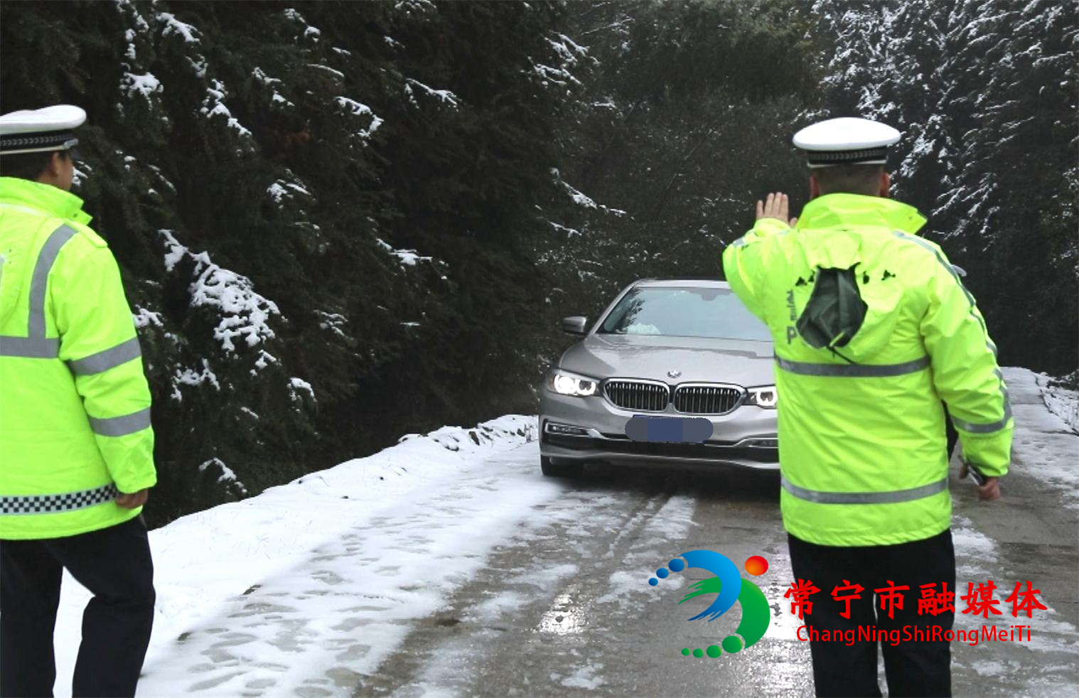 在常宁天堂山景区下的洋塔、弥塔公路,交警冒雪执勤,不间断开展路面巡逻工作,排除路面隐患,疏导景区滞留车辆安全通行。