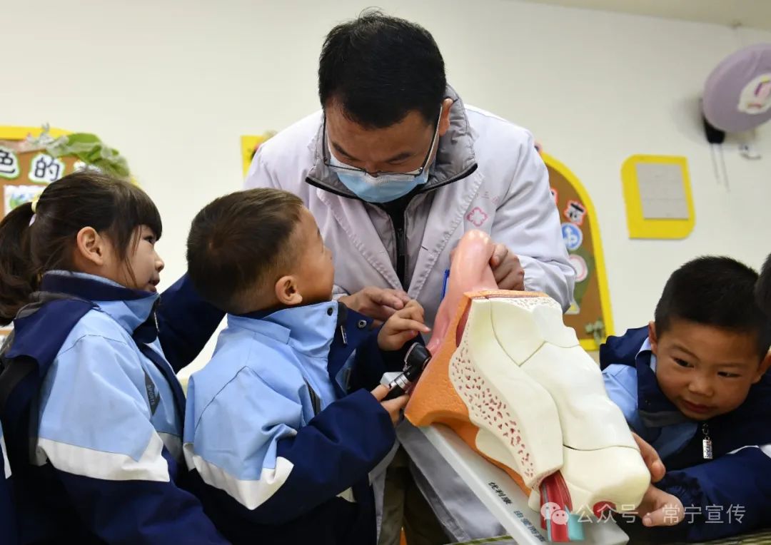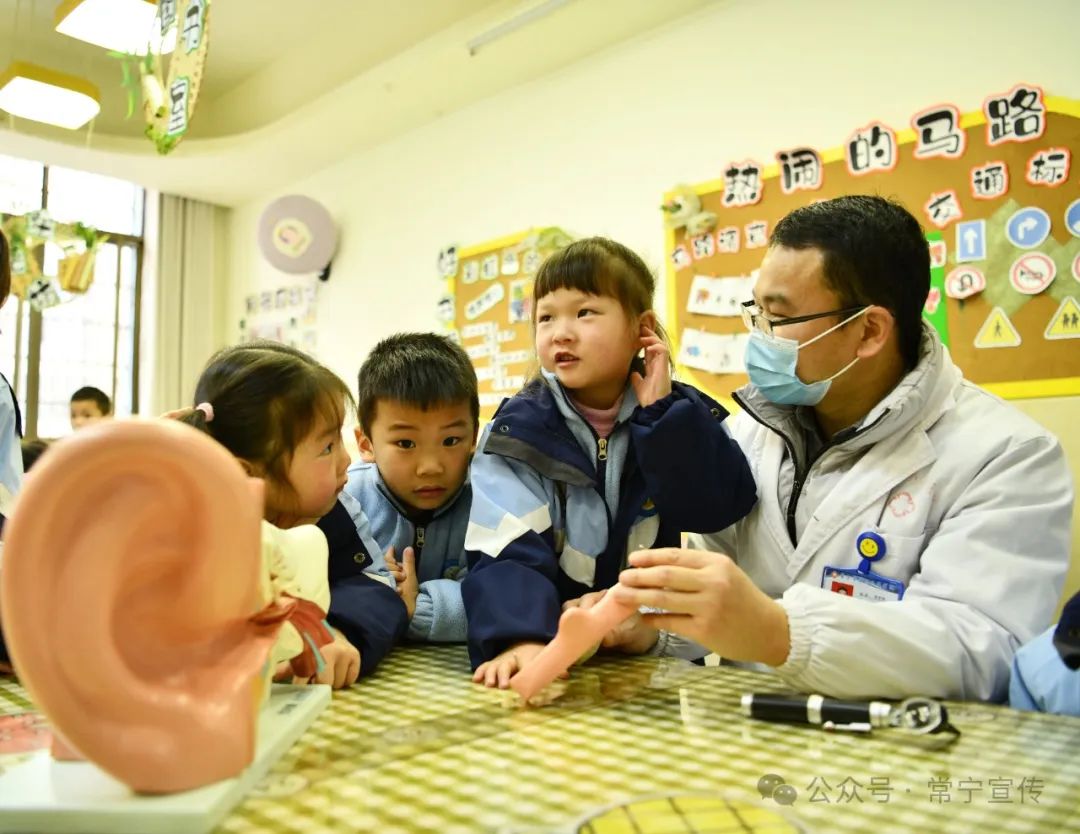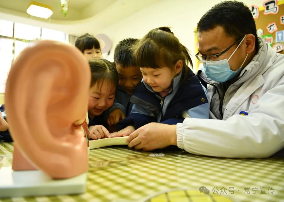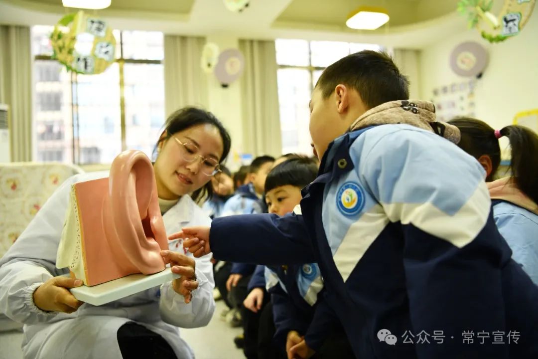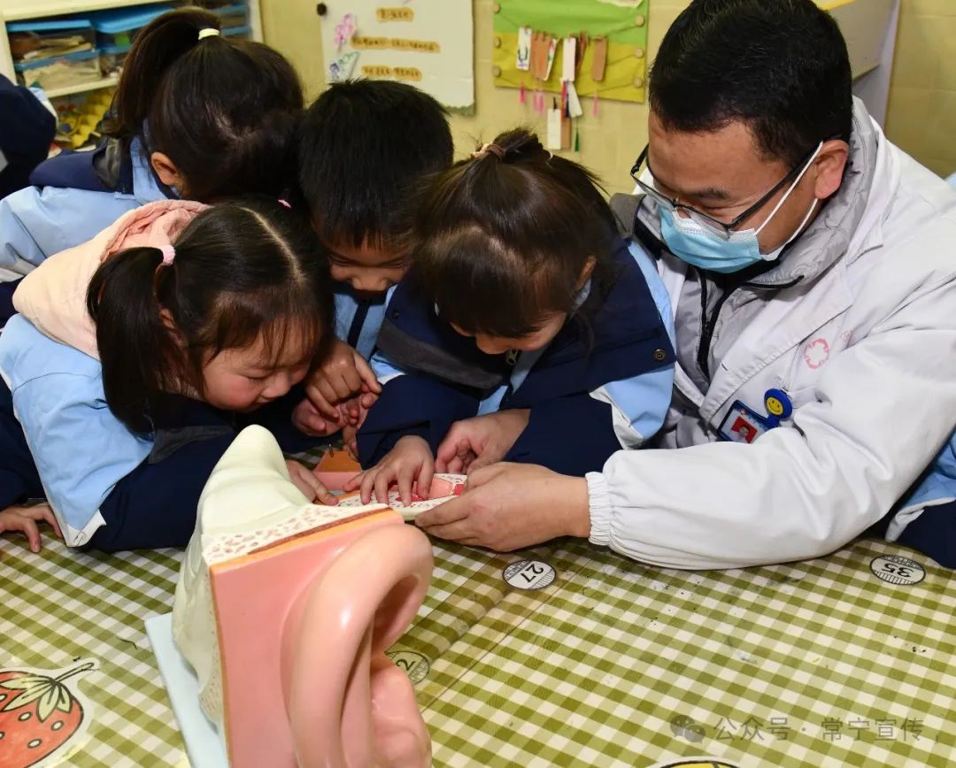 3月1日,常宁市第三人民医院医务人员通过耳朵模型向孩子们讲解耳朵的结构。