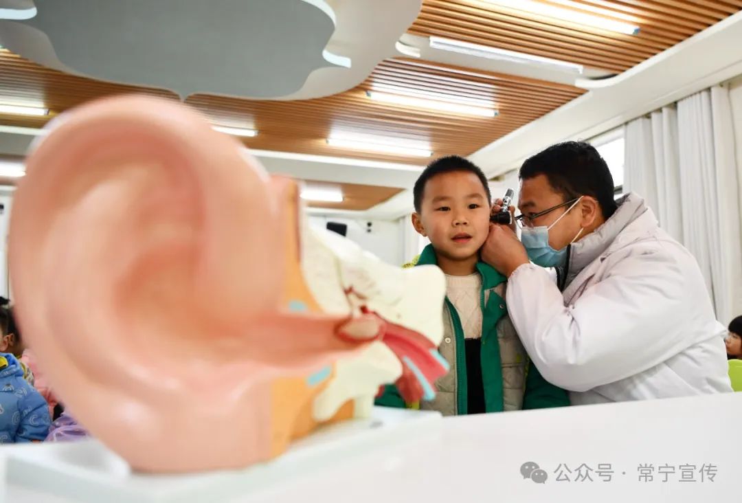 3月1日,常宁市第三人民医院医生正在教孩子们正确观察耳道健康。
