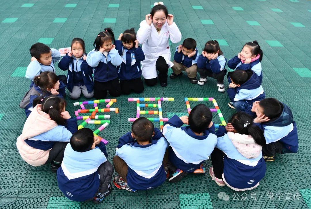 3月1日,在常宁市第二幼儿园,一名学校保健员和小朋友围在用积木摆放的“爱耳日”字样周围做护耳游戏。(曹莉媛 钱辉)