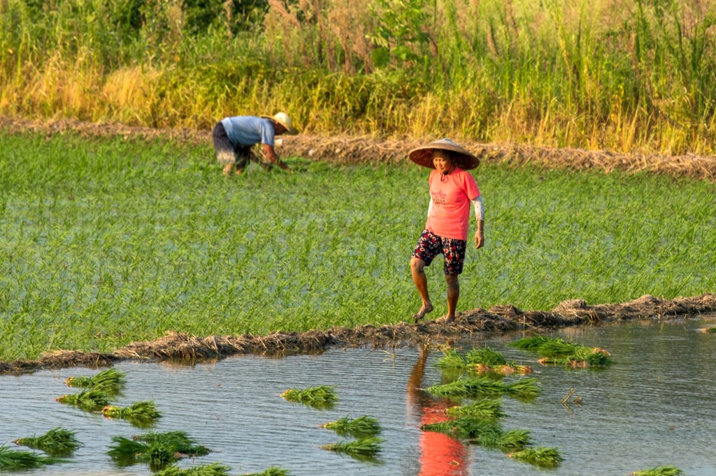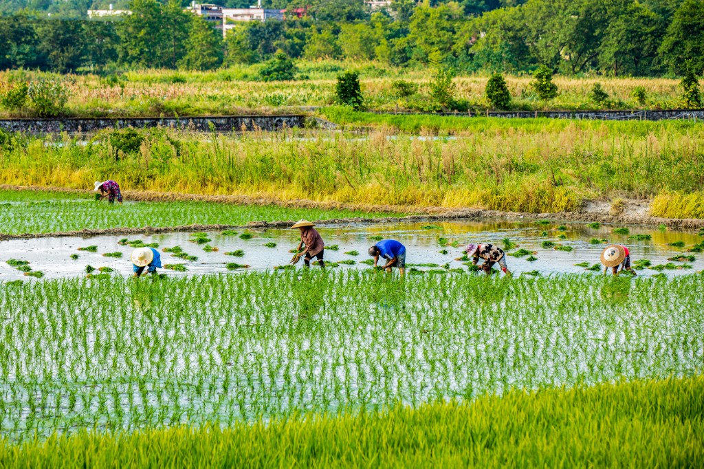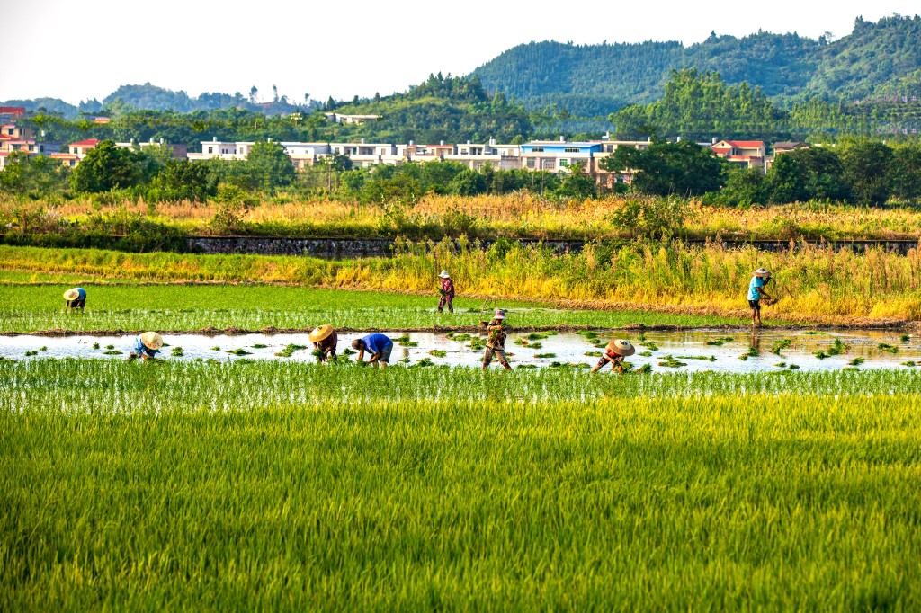 农户们正抢抓农时,在一块块规划整齐的水田里穿梭往复,拔苗、捆绑、插秧……田间地头呈现出一派夏种农忙景象。在农户们的辛勤劳作下,一块块水田披上了绿装。(廖学能)