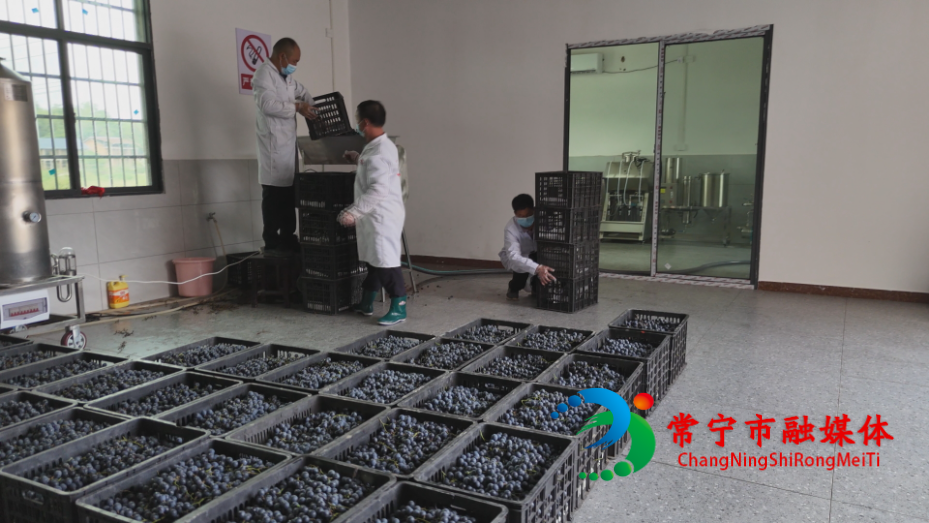 秋分过后,迴江村酿酒工坊内一派繁忙。一框框刚采摘的黑提果肉饱满、色泽鲜亮,工作人员将成串的葡萄手工倒入破碎机。果粒在机械作用下均匀破碎,紫红的汁水与果肉顺着管道汩汩流入发酵桶,浓郁的果香在车间里悄然弥漫。崭新的设备有序运转,辅料按序码放,工人们各司其职,整个工坊在紧凑而有序的节奏中,酝酿着属于秋天的甘醇。