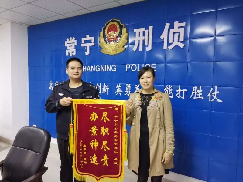 9月30日上午,水口山镇廖女士专程来到刑侦大队,送来一面印有"办案神速、尽职尽责"的鲜艳锦旗,对办案民警成功为其追回被诈骗的近5万元钱表达感谢之情。