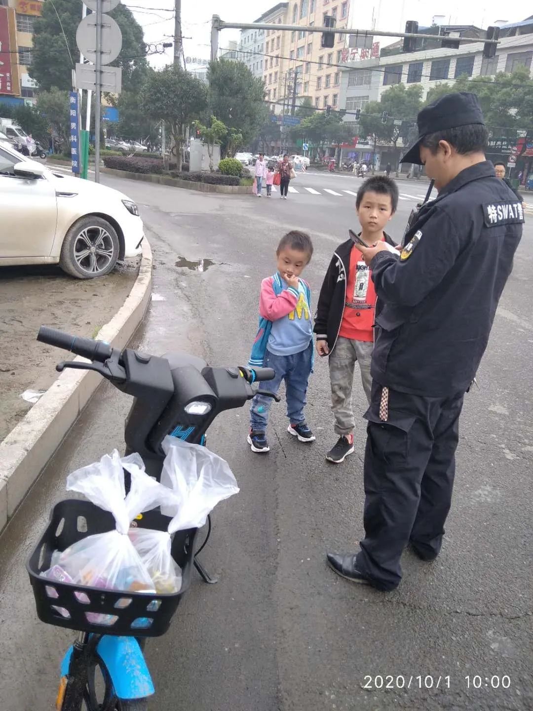 10月1日上午,巡特警巡逻队员在市交通路十字路口发现两名小孩没有家长陪同,自己骑共享单车摔倒在路边,便立马上前救助。出于安全考虑,巡逻队员将两名小孩护送到其位于北外街的家中,交到其母亲吴某某手中。