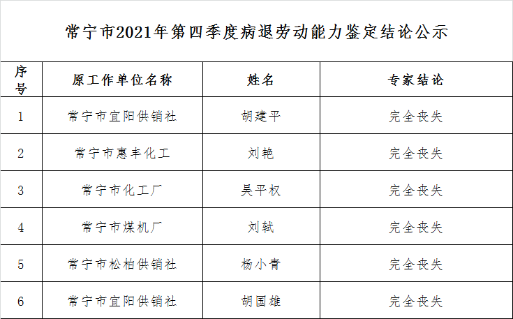 附:常宁市2021年第四季度病退劳动能力鉴定结论公示