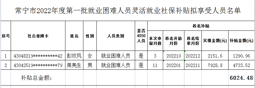 根据湘人社规[2020]22号文件精神,现拟对常宁市就业困难人员给予就业困难人员灵活就业社保保险补贴(名单附后)。公示期7天。如有异议,请于2022年10月8日前,通过当面、电话或邮寄方式向常宁市人力资源和社会保障局反映,逾期不予受理(邮寄的日期以邮戳为准,直接送达的以送达日期为准)。