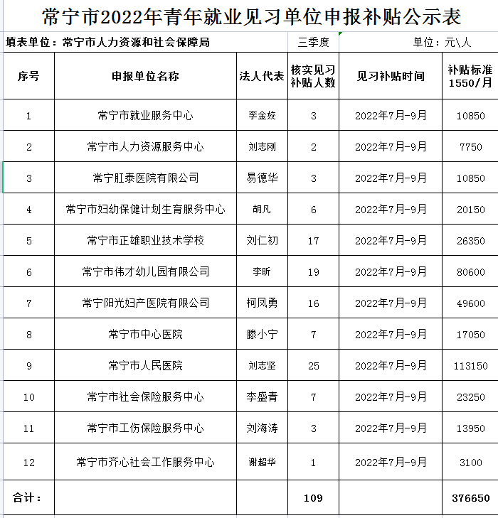 根据湖南省人力资源和社会保障厅,财政厅等六部门《关于实施三年3万青年见习计划的通知》(湘人社函[2019]86号) 精神,为做好高校毕业生或失业青年(16-24周岁) 就业见习工作,结合本市产业发展和青年见习需求,现将有12家申报青年就业见习单位109名见习生具备见习条件,现予以公示(名单附后),接受社会监督。如在公示期内有异议,请于2022年10月26日前,通过当面. 电话或邮寄方式反映。公示期满无异议,将给予就业见习单位人员补贴,公示期7天。