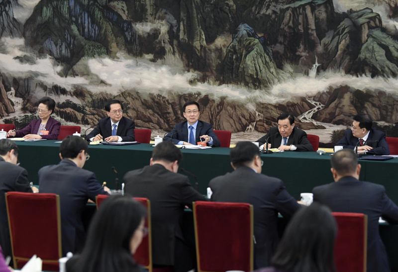 3月7日,中共中央政治局常委、国务院副总理韩正参加十三届全国人大二次会议浙江代表团的审议。新华社记者 高洁 摄