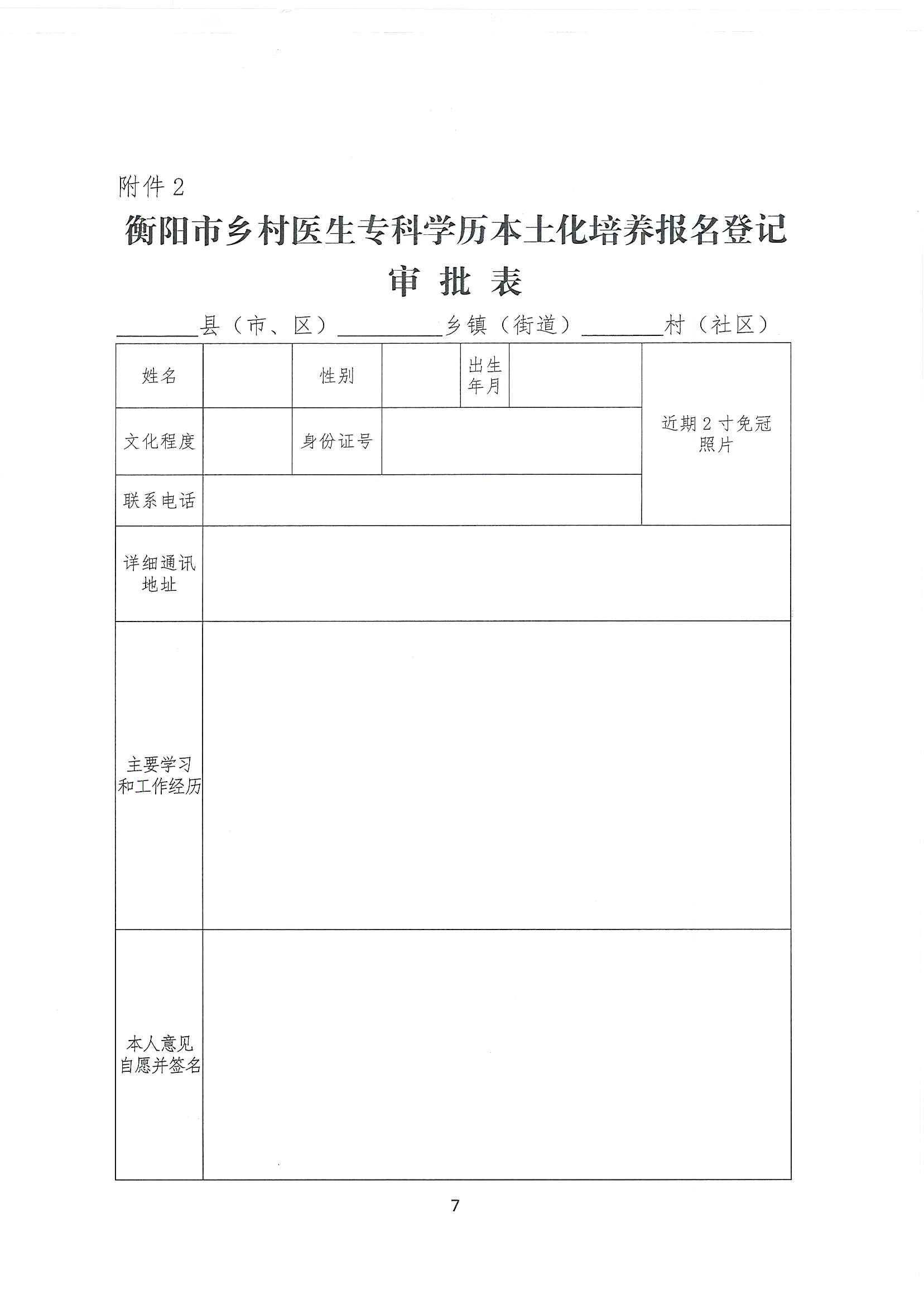 (二)资格审查。2月27日前,志愿报考人员经行政村、乡镇卫生院逐级推荐审批签字同意盖章后,提交身份证件、2026年湖南省普通高校招生考试考生报名登记表、身体健康体检合格证明等相关资料,到市卫生健康局基卫股报名,并签订《衡阳市乡村医生专科学历本土化培养承诺书》(附件1),《衡阳市乡村医生专科学历本土化培养报名登记审批表》(附件2)。